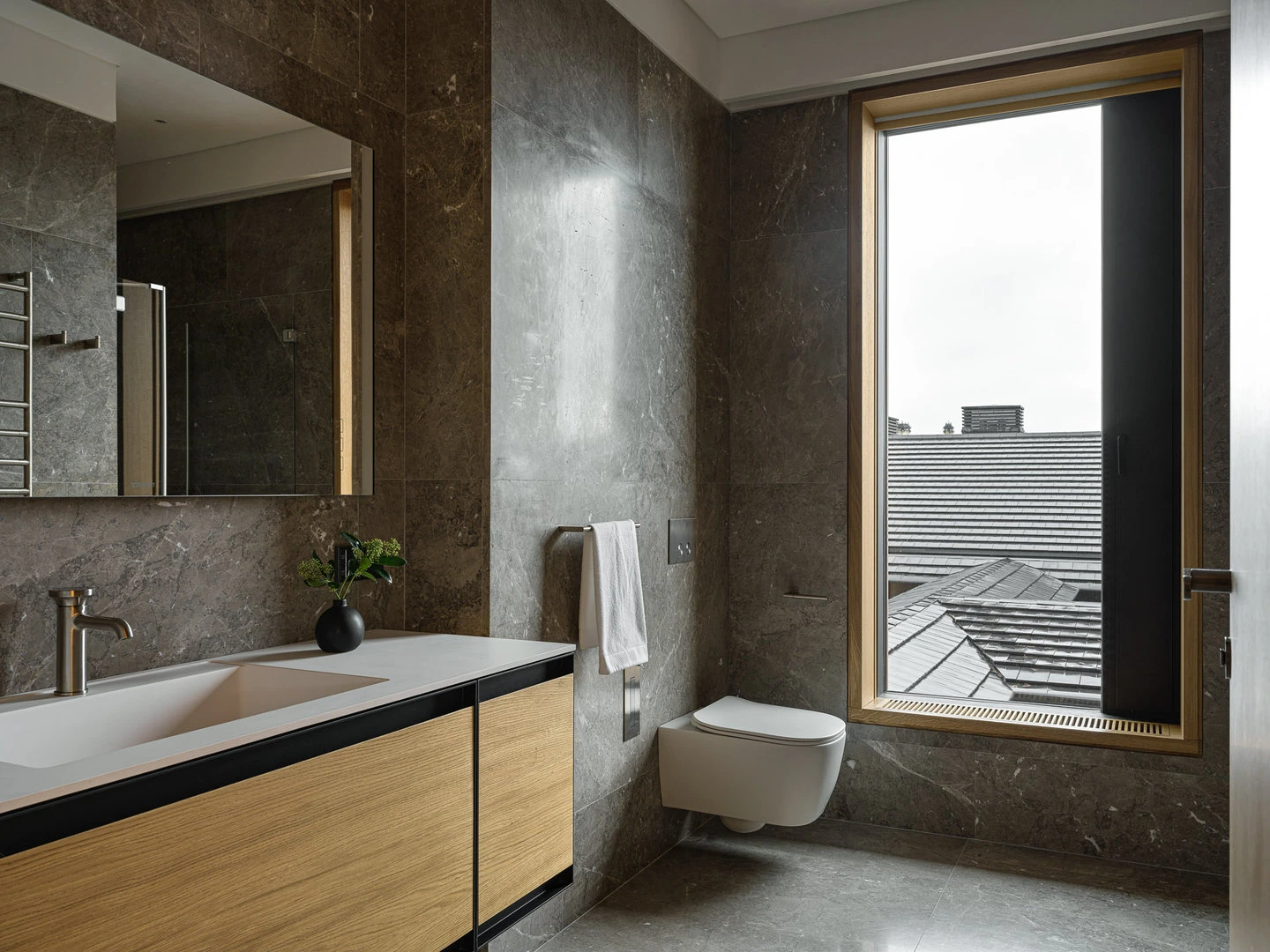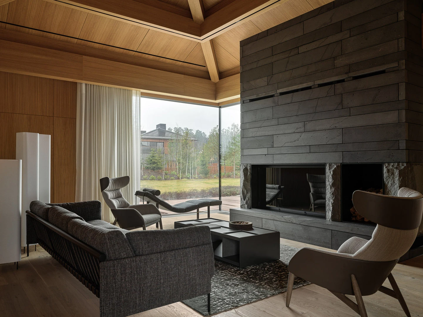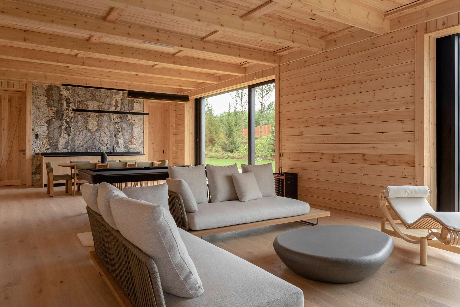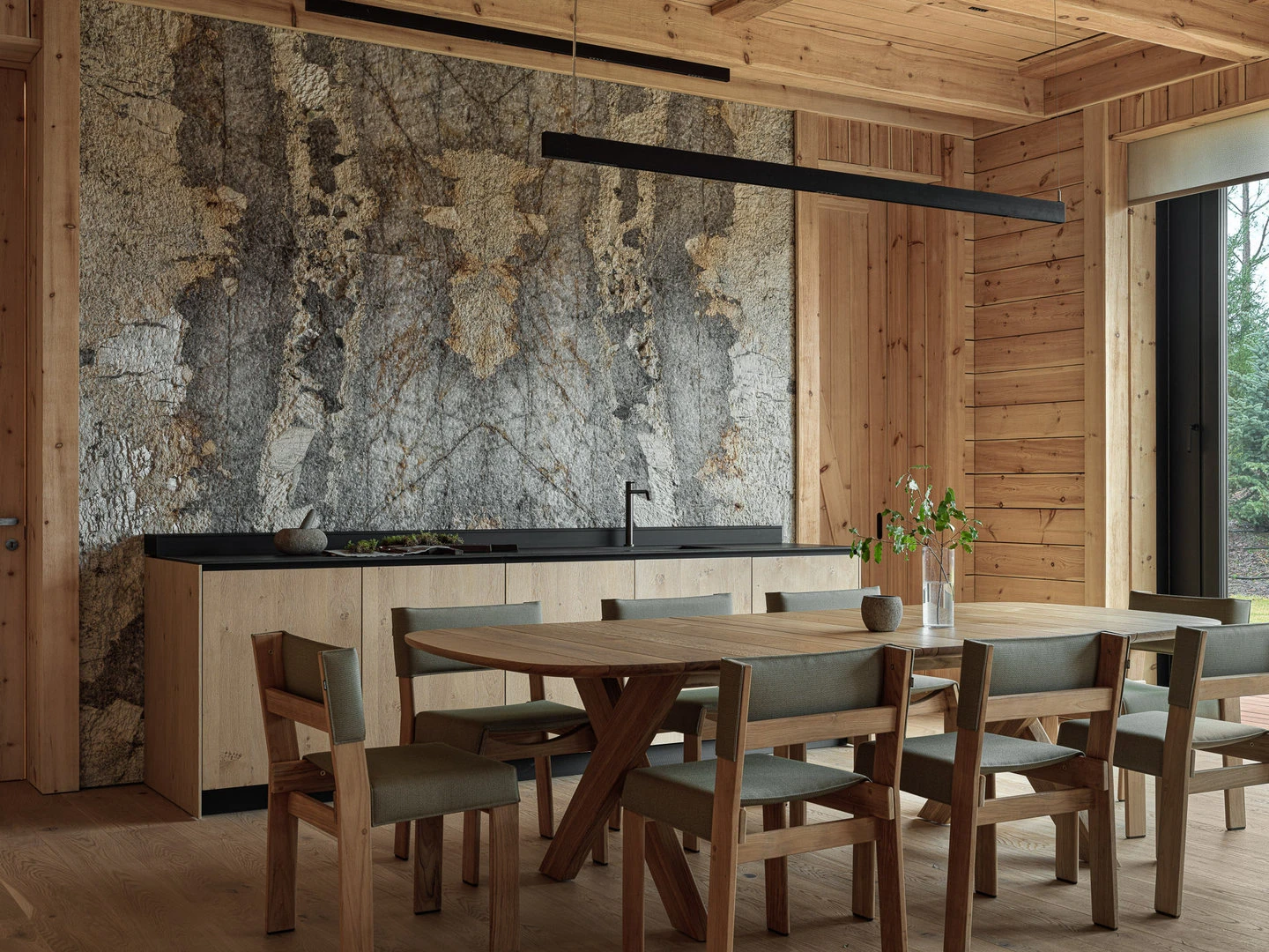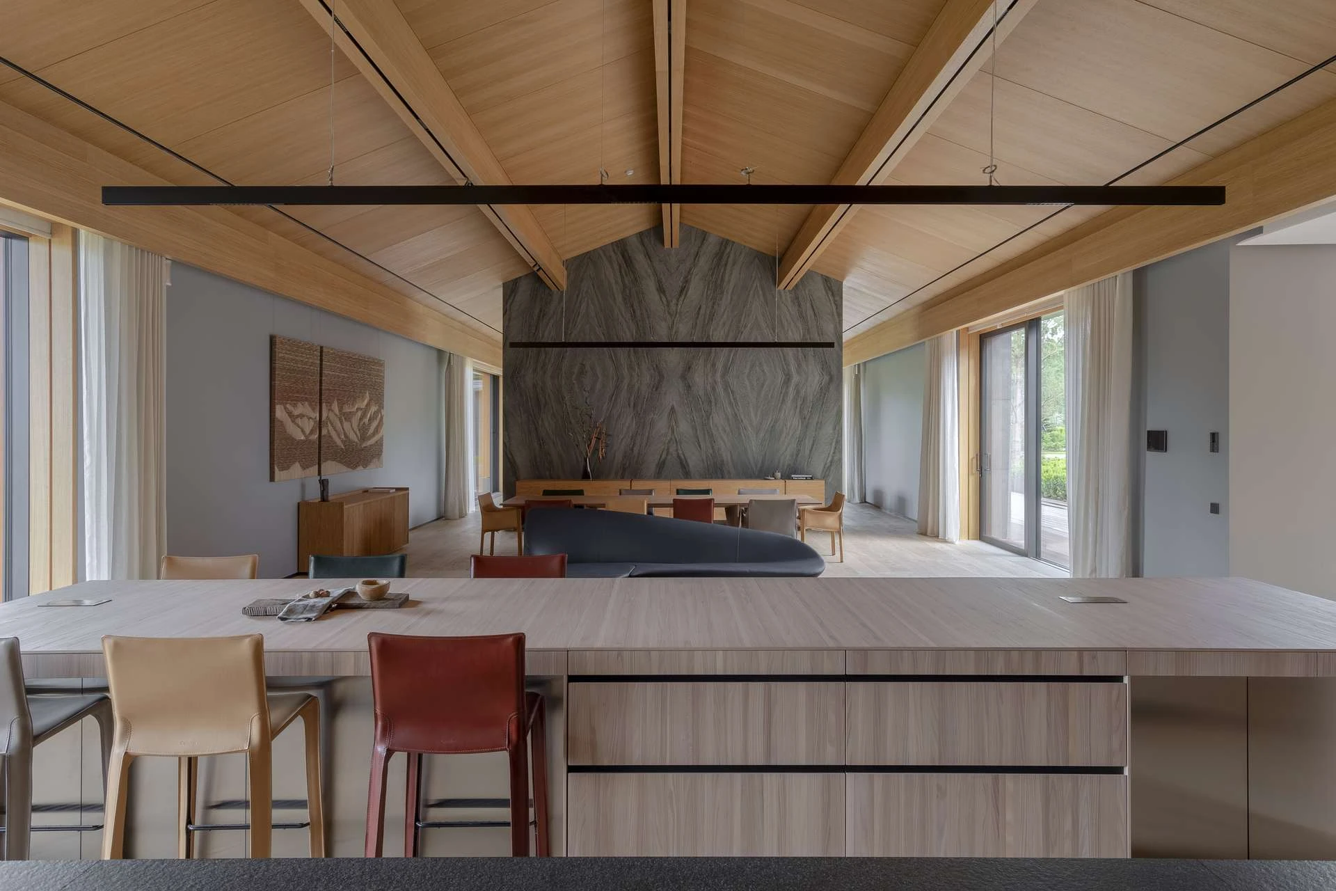Создавая планировку, мы добивались плавности — чтобы материал под ногами не менялся, в отделке преобладало дерево, а перед глазами была природа. Продумали уровни — если и подниматься, то в спальню. Сделали так, чтобы помещения перетекали одно в другое, а каждая комната рассказала свою историю — отдыха, общения, работы, созерцания. Позаботились о материалах — терраса и приватные пространства отделаны деревом, а территории общения — натуральным камнем.