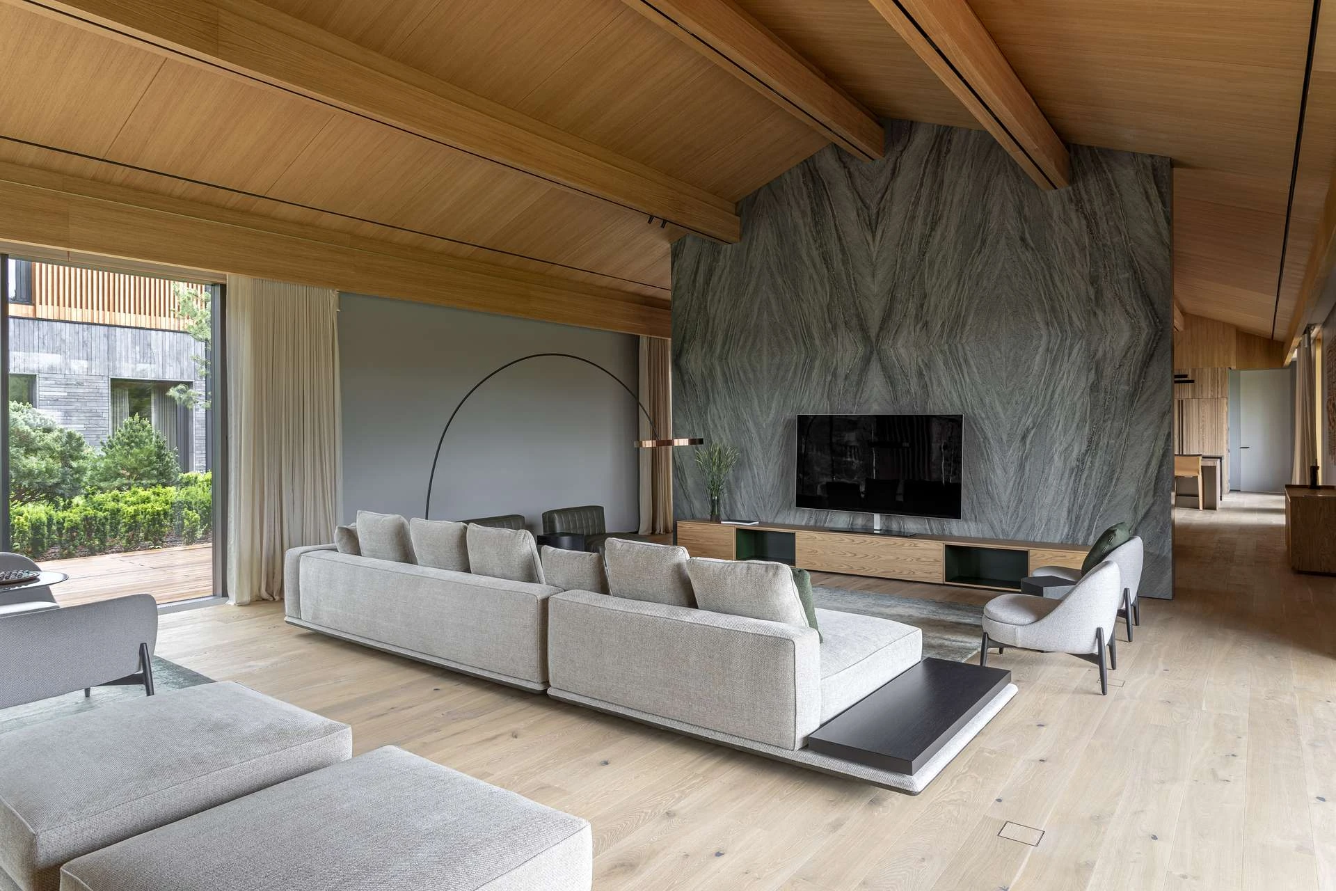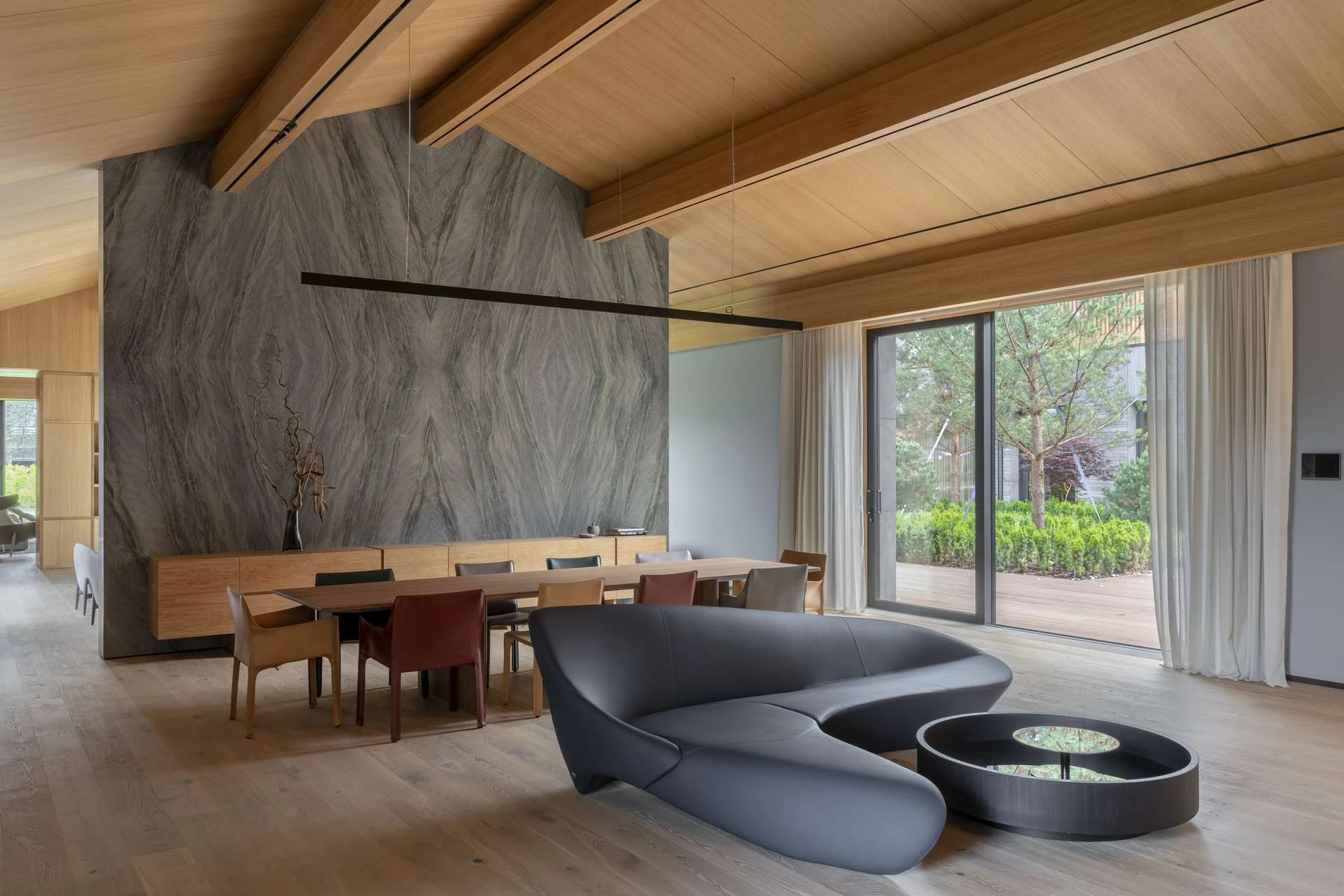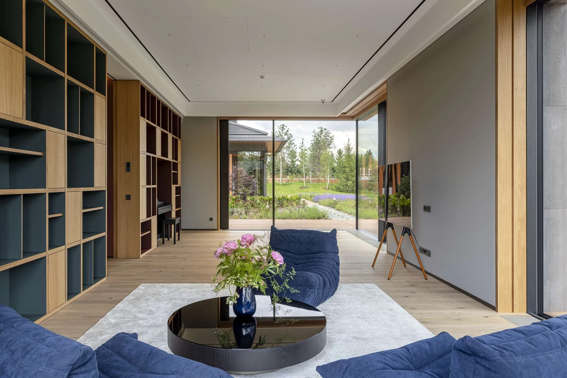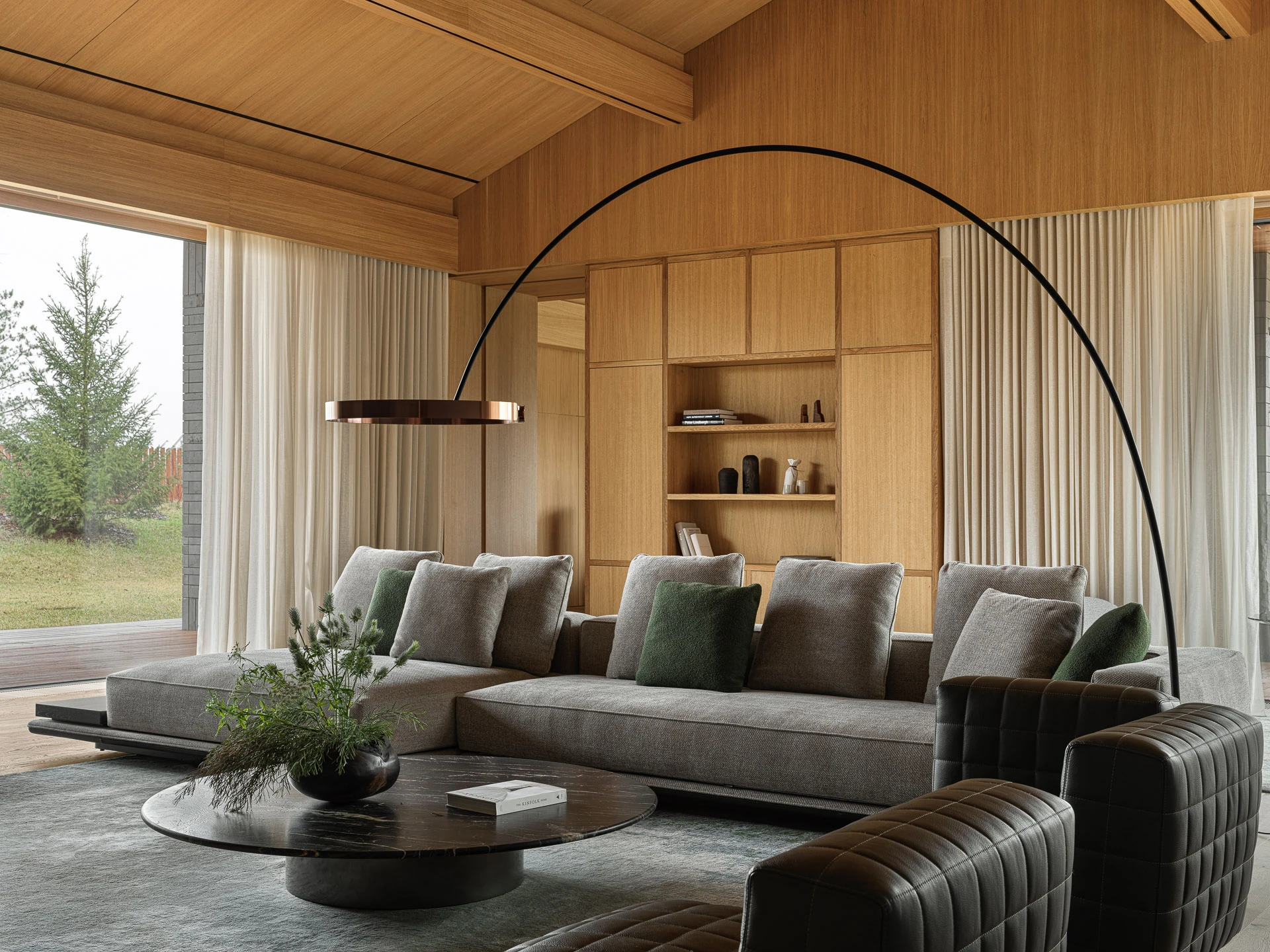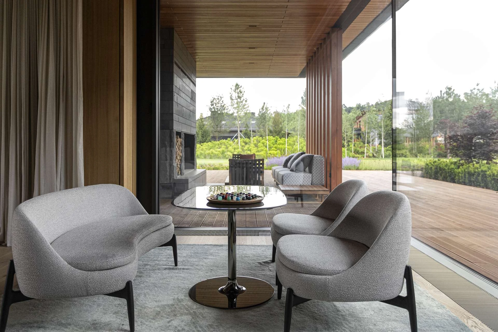 История гостиной — о том, что вся семья в сборе и есть время поговорить. Удобный диван и мягкие кресла настраивают на беседу, а природа за окном становится ее частью. Сад через панорамные окна выглядит продолжением гостиной.