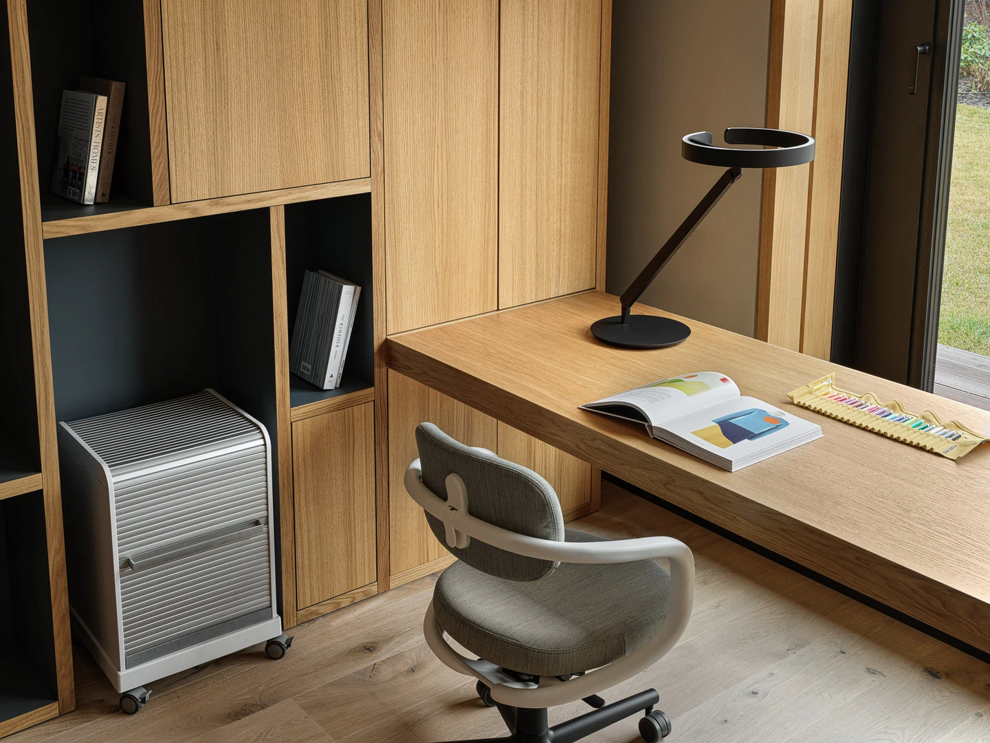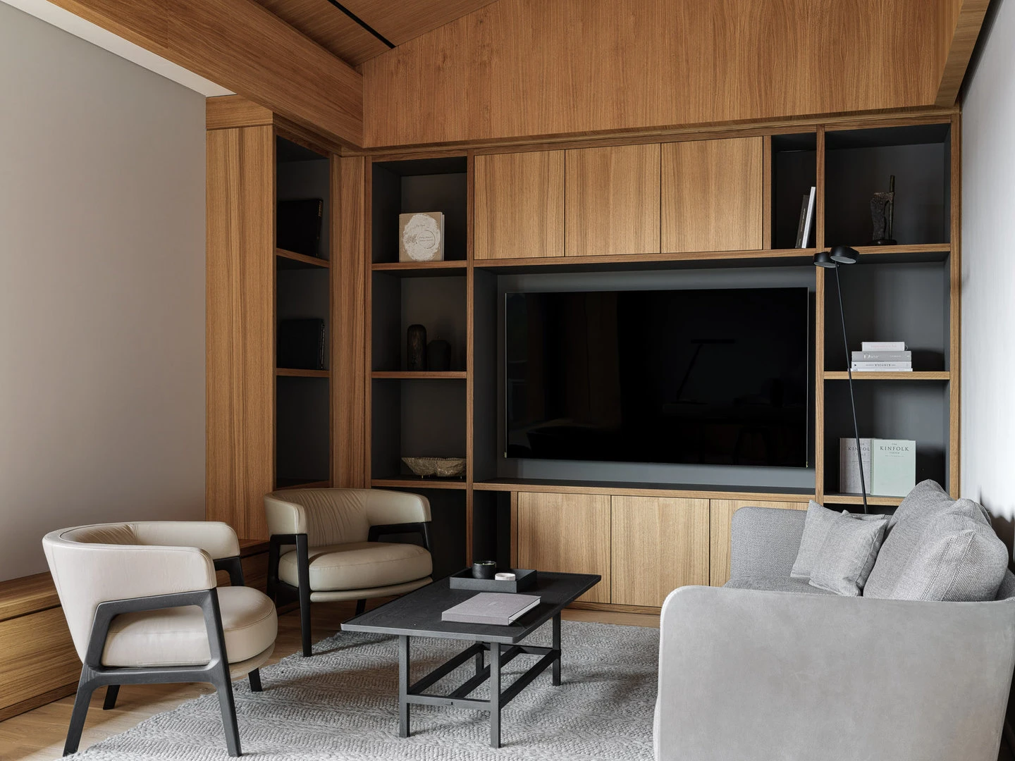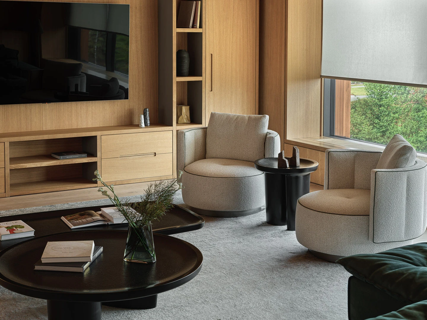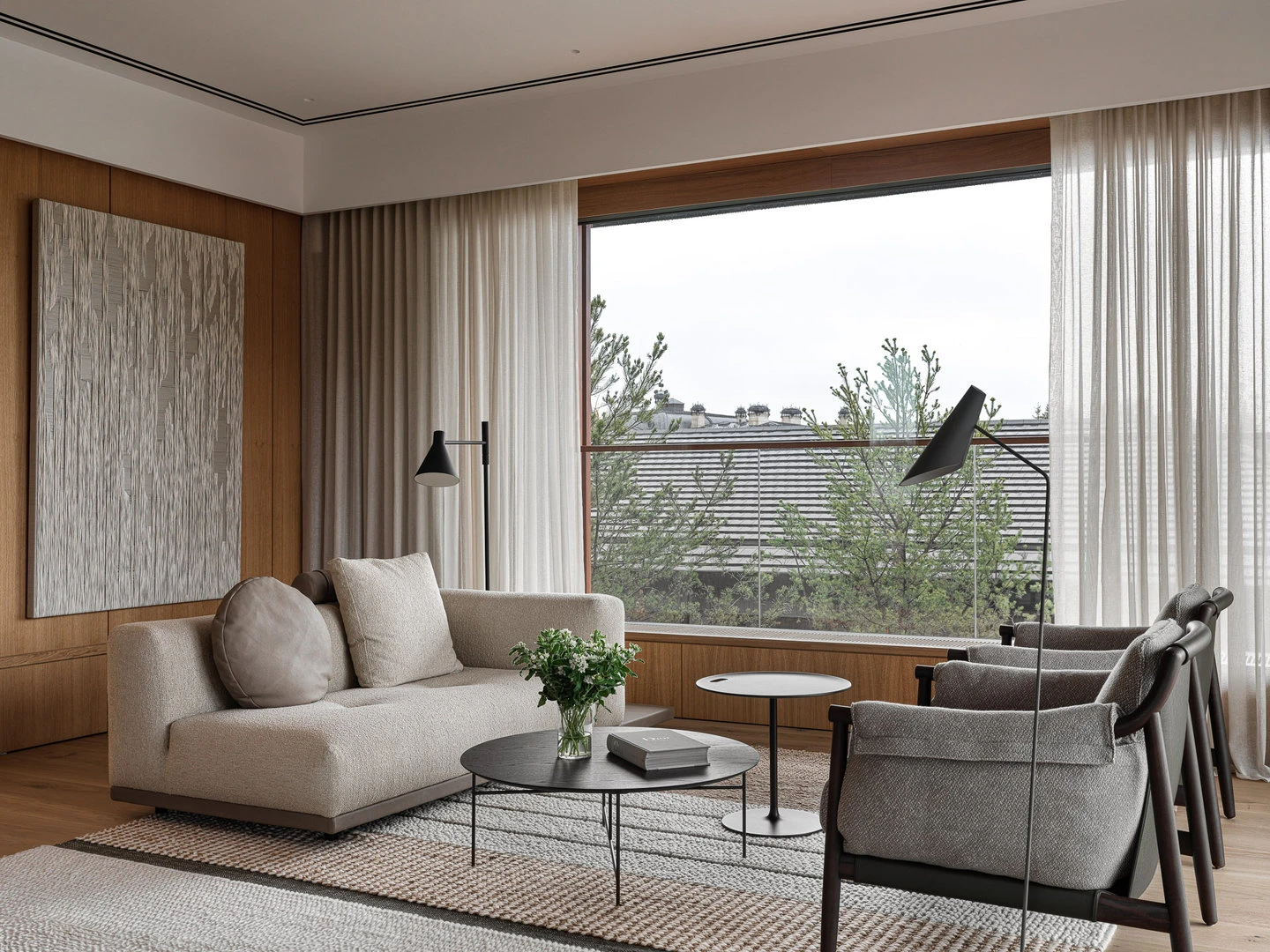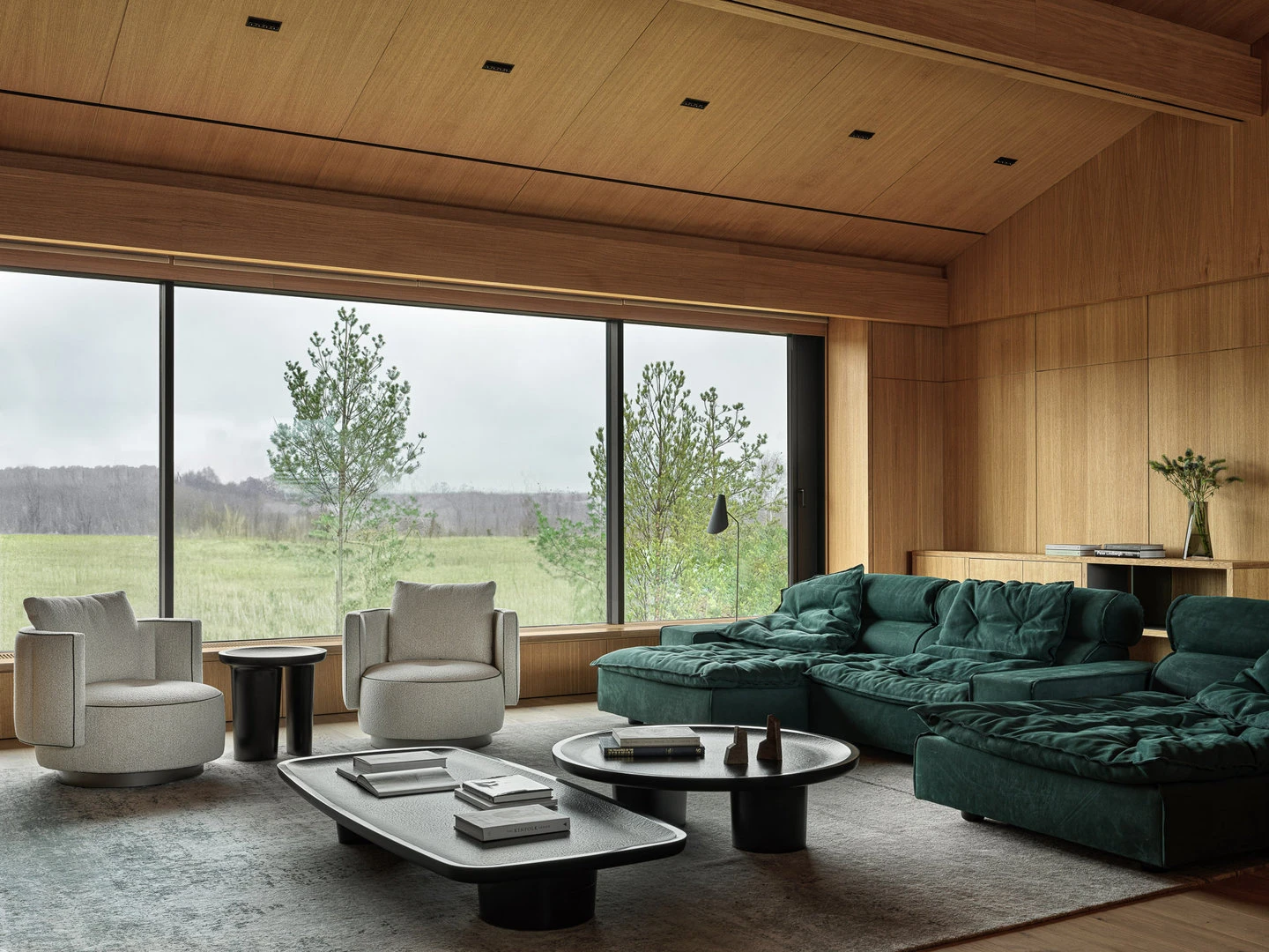 История гостиной — о том, что вся семья в сборе и есть время поговорить. Удобный диван и мягкие кресла настраивают на беседу, а природа за окном становится ее частью. Сад через панорамные окна выглядит продолжением гостиной.