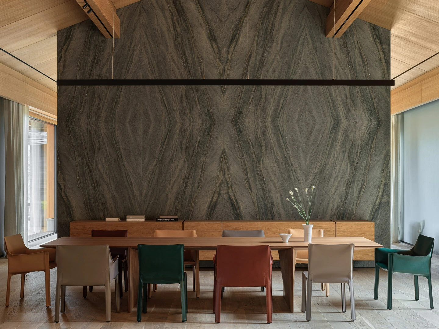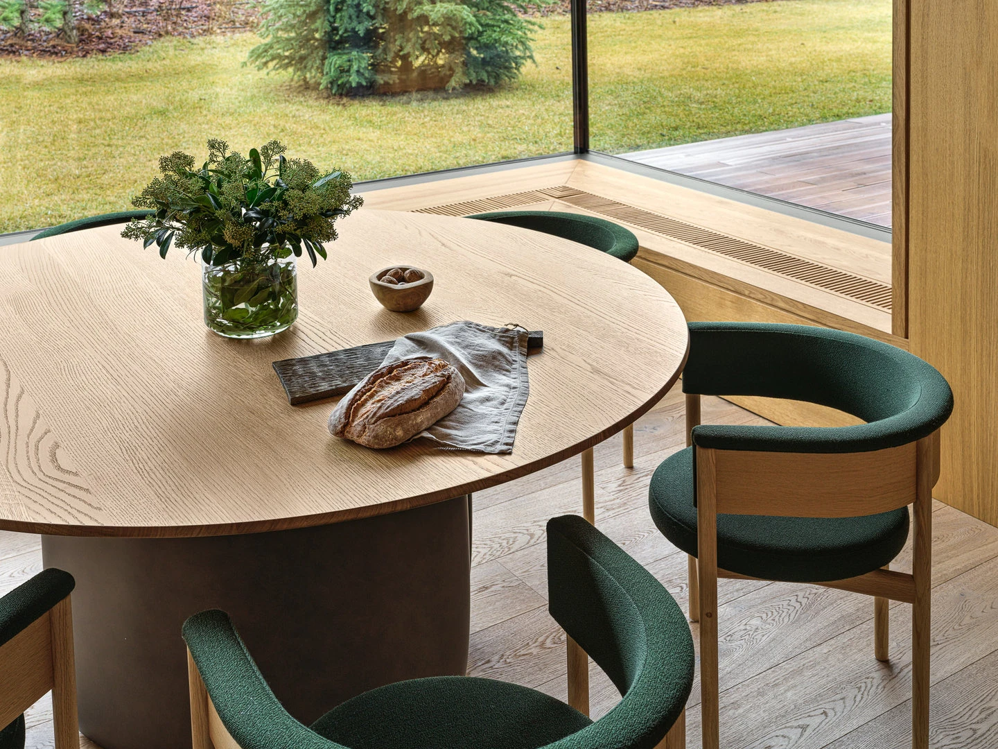 В столовой семья собирается чаще всего. Ее обстановка умиротворяет — в отделке преобладает дерево, а тон всему помещению задает основательный обеденный стол в окружении комфортных стульев. Свет мягкий и приглушенный, а открытый интерьер создает ощущение воздуха.