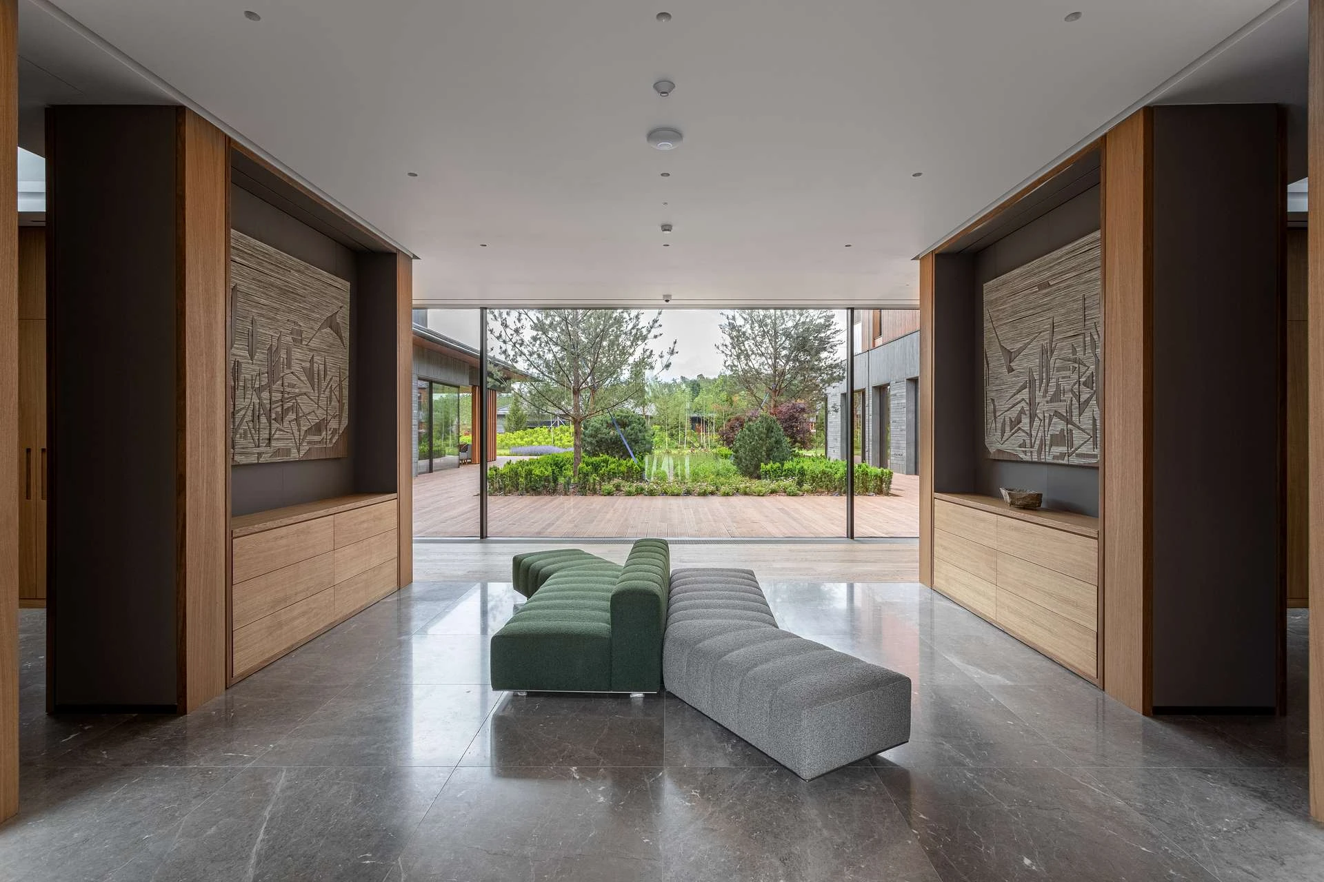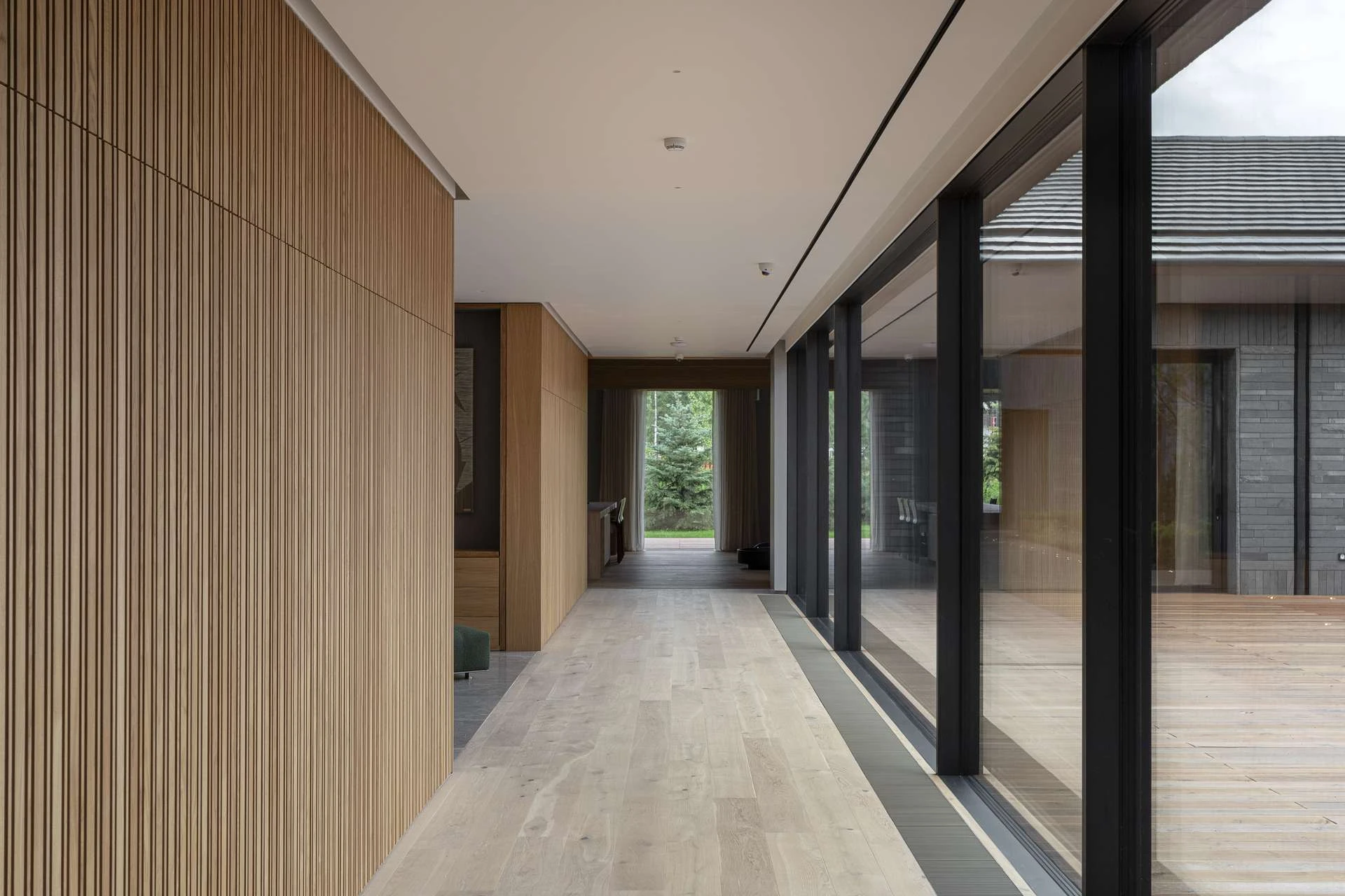 Просторный холл как гостеприимный хозяин — встречает, располагает и провожает во внутренние покои. Интерьер подчеркивает близость к природе — холл отделан натуральными материалами и наполнен естественным светом, льющимся из панорамных окон.