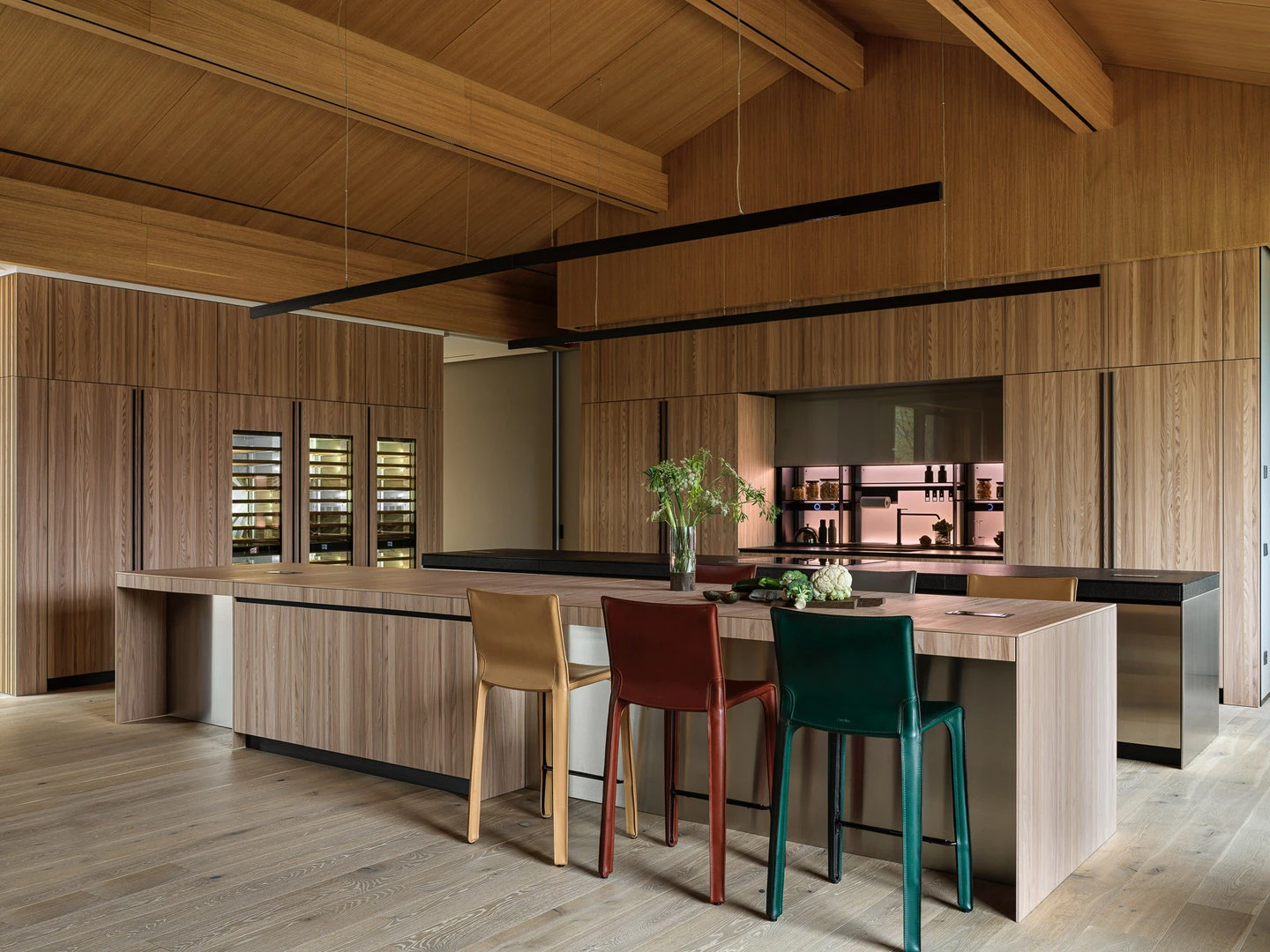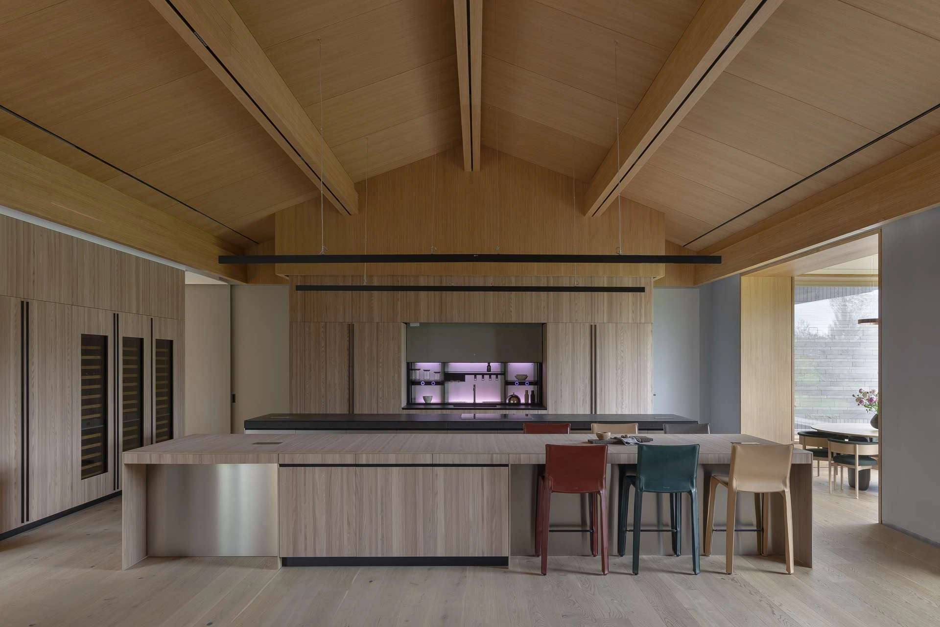 Просторная парадная кухня с двумя широкими «островами» располагается по соседству со столовой. К кухне примыкает стеклянный эркер с зоной для завтраков.