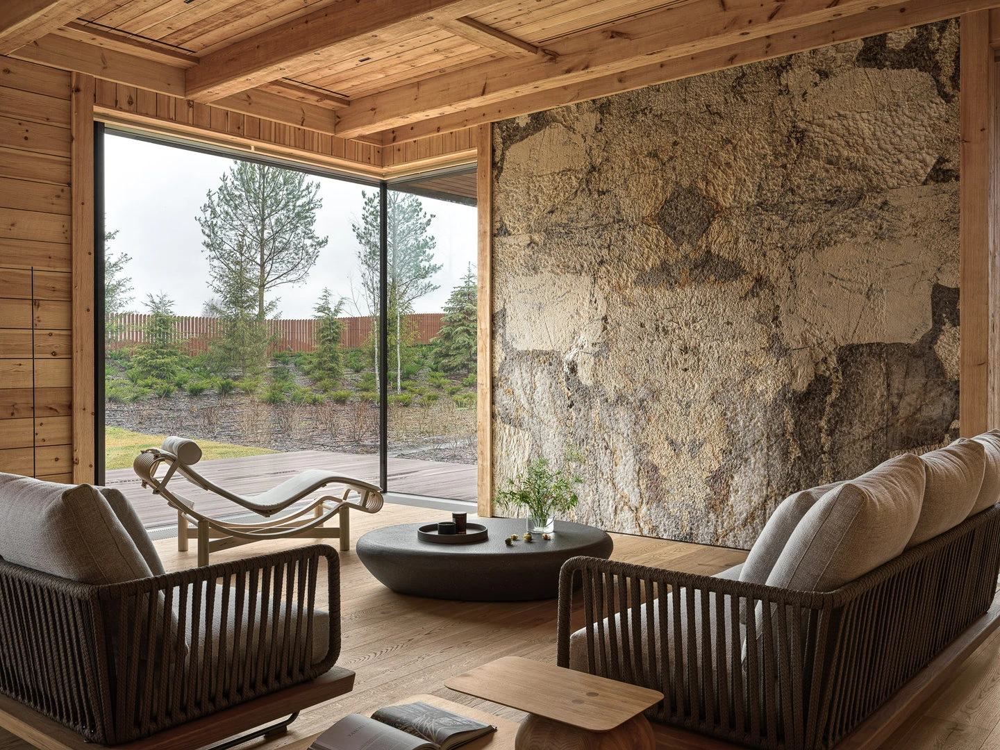 В интерьерах, отделанных состаренным деревом, жизнь замедляется до минимума. Бассейн продолжает спа-зону. Особые панорамные окна раскрываются целиком, и бассейн с террасой объединяются, превращаясь в территорию абсолютного расслабления.